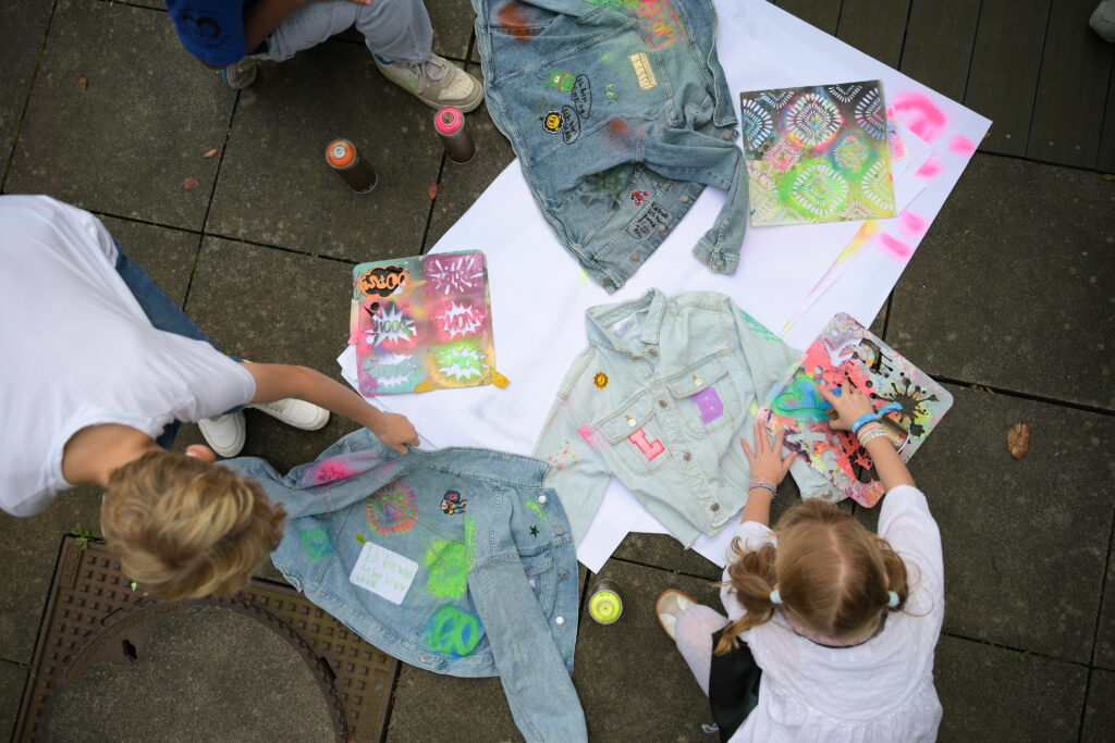 Einige Schülerinnen und Schüler nahmen an einem abwechslungsreichen Workshop-Programm teil, das Mitbestimmung, Kreativität und Teamgeist förderte. Dabei entstanden unter anderem individuell gestaltete Secondhand-Jeansjacken und ein buntes Kreide-Graffiti als gemeinsames Statement für Kinderrechte.