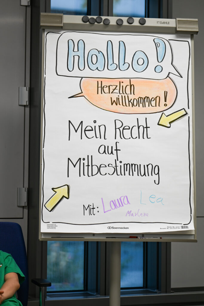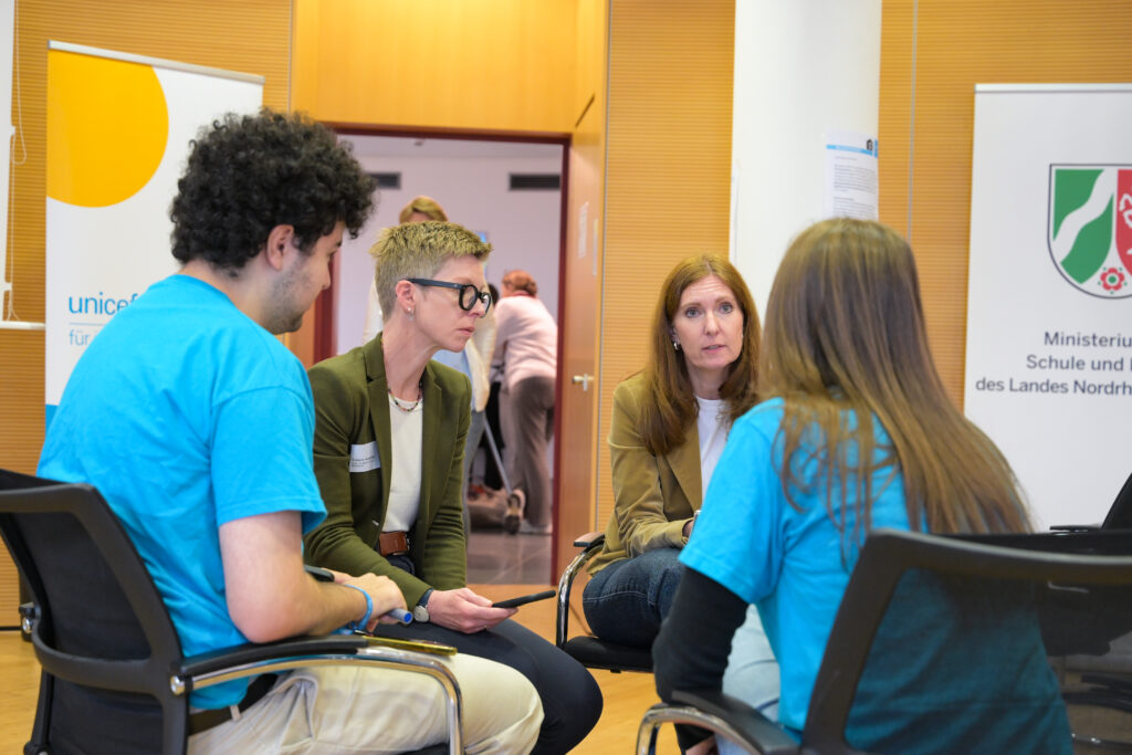 Begrüßt wurden die teilnehmenden Schulen von Dorothee Feller, der Ministerin für Schule und Bildung des Landes NRW. Sie beglückwünschte die Schulen zu ihrem Engagement und sprach mit Schülerinnen und Schülern darüber, warum Kinderrechte im schulischen Alltag eine so wichtige Rolle spielen.